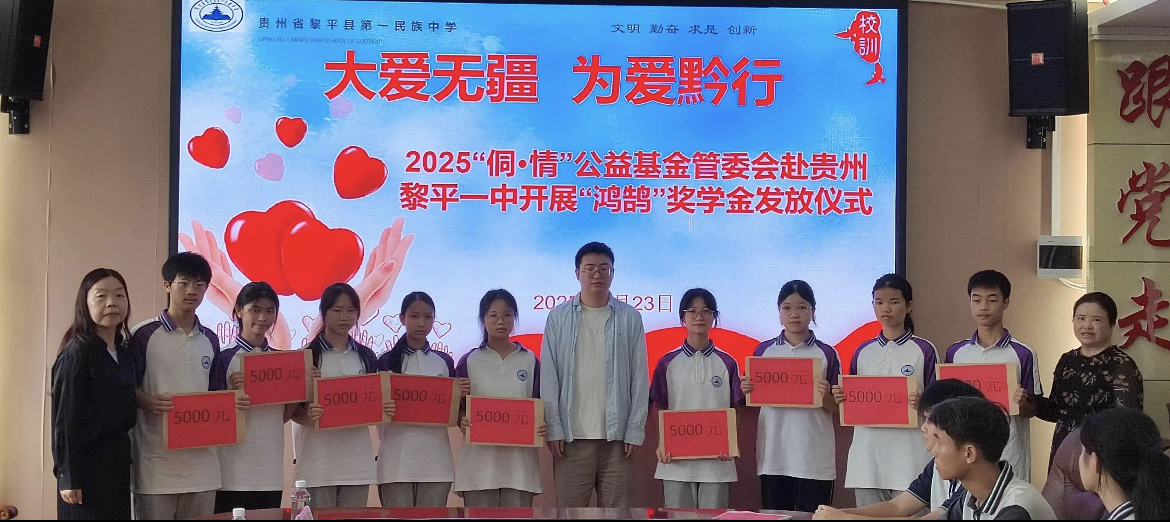2025年,为守护贵州黎平县品学兼优却因家境困难而求学受阻的学子们的求学梦想,“侗・情” 公益基金正式启动 “鸿鹄” 助学项目。该项目精准聚焦贵州黎平地区,面向当地品学兼优、家庭经济困难的小学生和高中学生,提供每月500元的生活补助金,以切实行动守护他们珍贵的求学时光。此次赴黎平一中开展奖学金发放仪式,正是“鸿鹄”助学项目在高中阶段帮扶的具体落实。发放仪式现场,气氛庄重而热烈。“侗・情”公益基金管委会代表、黎平一中校长、学生齐聚一堂,共同见证这一温暖时刻。